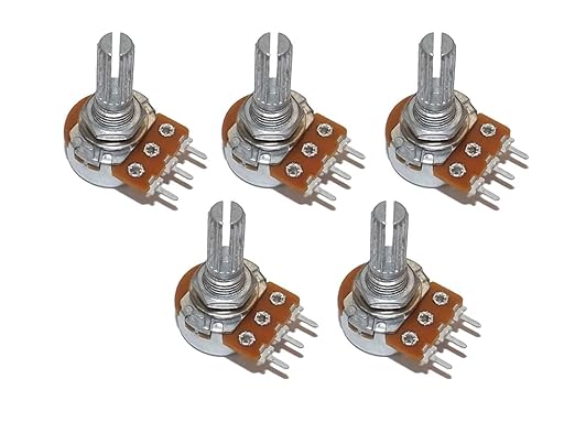 General purpose single shaft 10k ohms pack of 5 Product name: potentiometer; resistance value: 10k ohm; adjustment type: top adjustment.